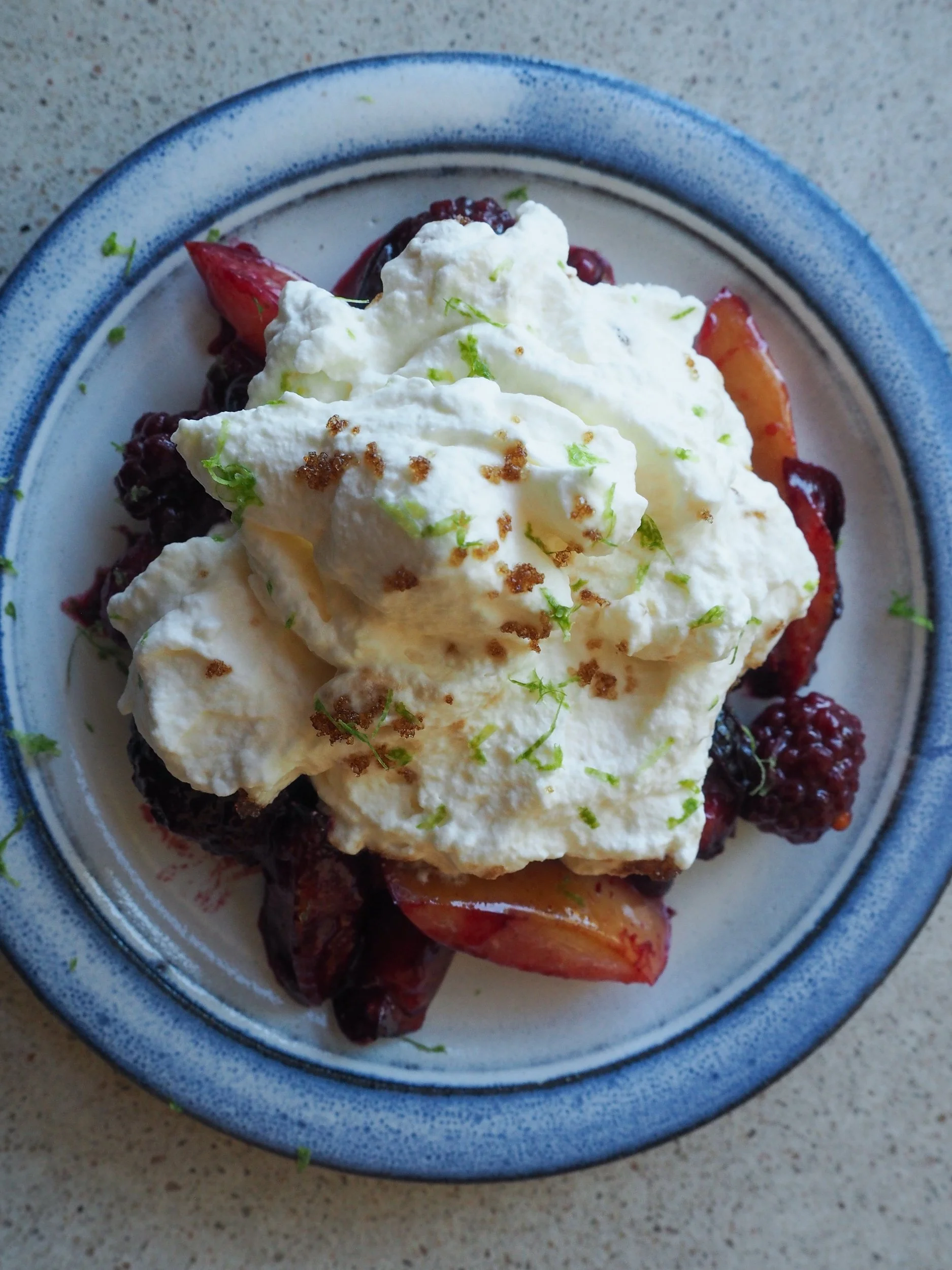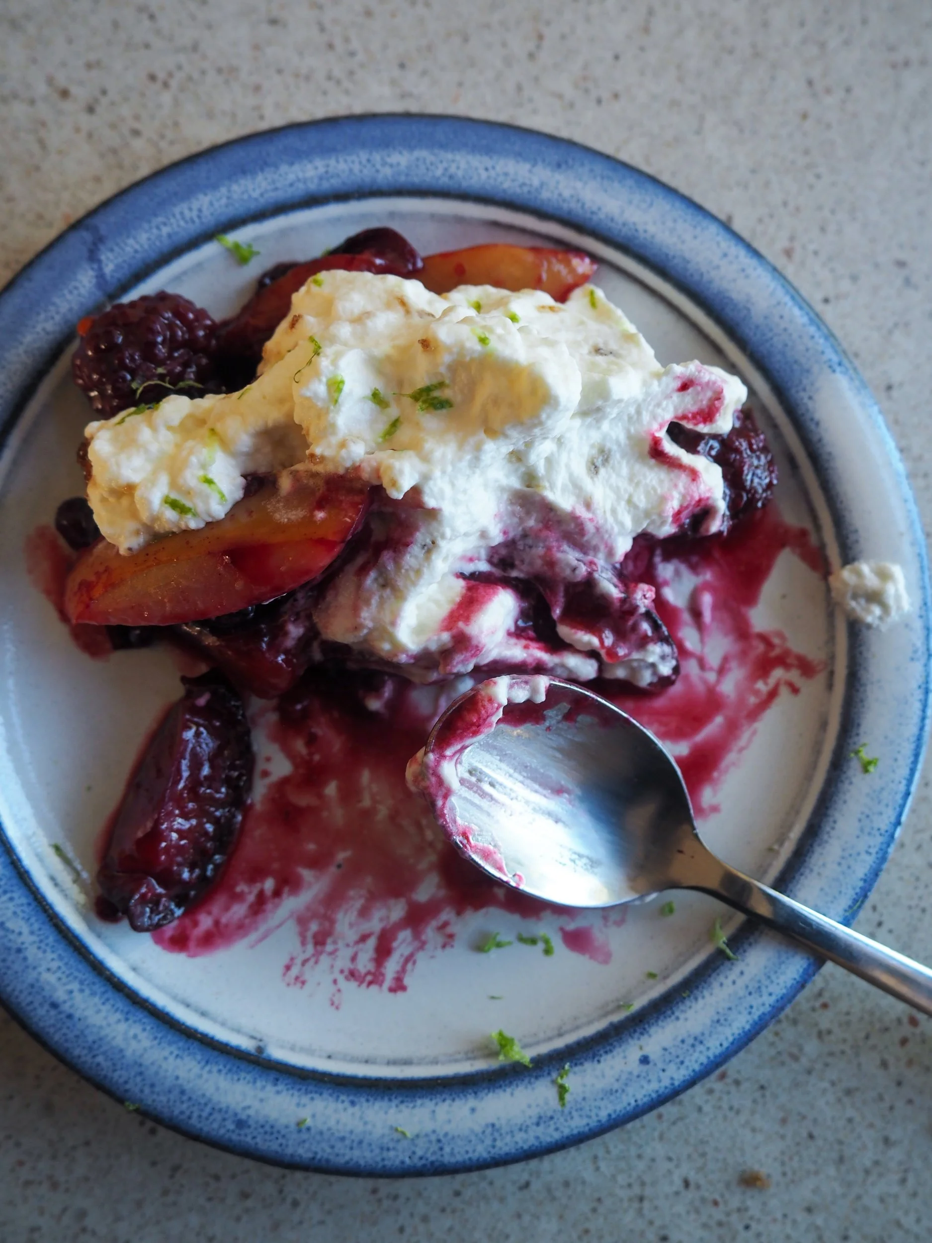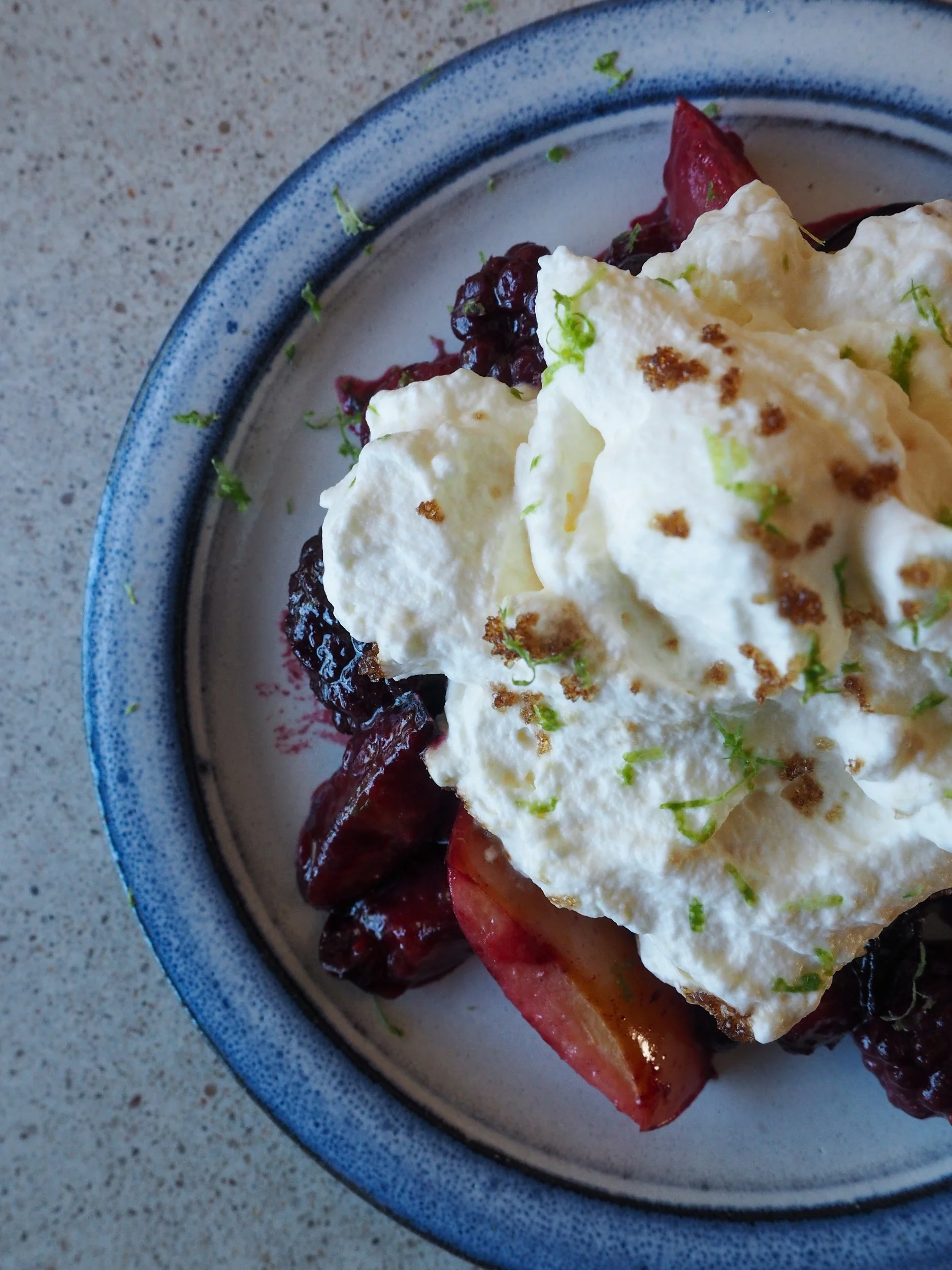 Server de varme plommene og bærene toppet med en god klatt sukret krem eller yoghurt. Pynt med limeskall eller mynte for litt friskhet.