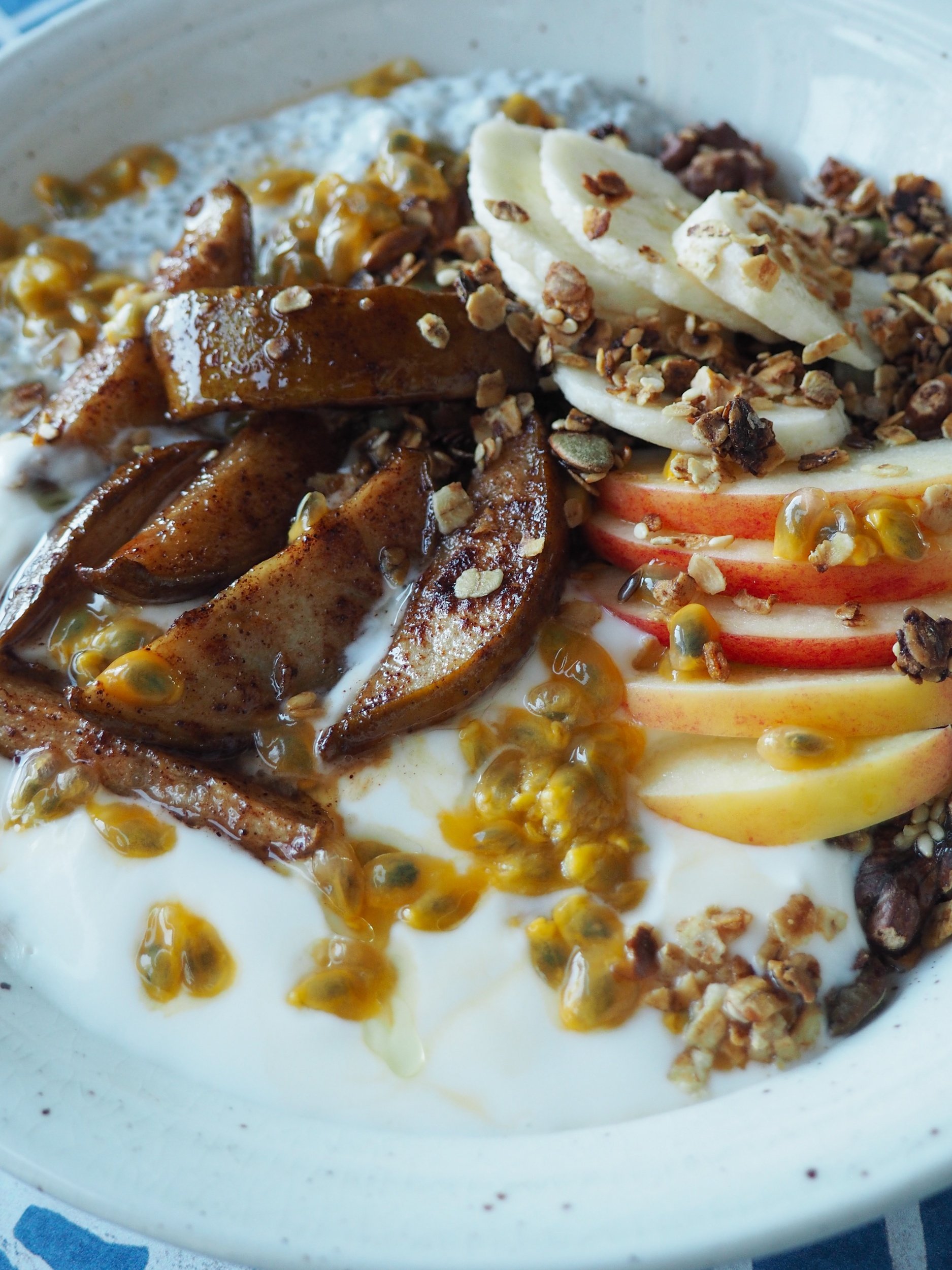 LUKSUS FROKOSTSKÅL - en herlig bolle med chiapudding og yoghurt, her toppet med granola, stekte pærer og pasjonsfrukt.
