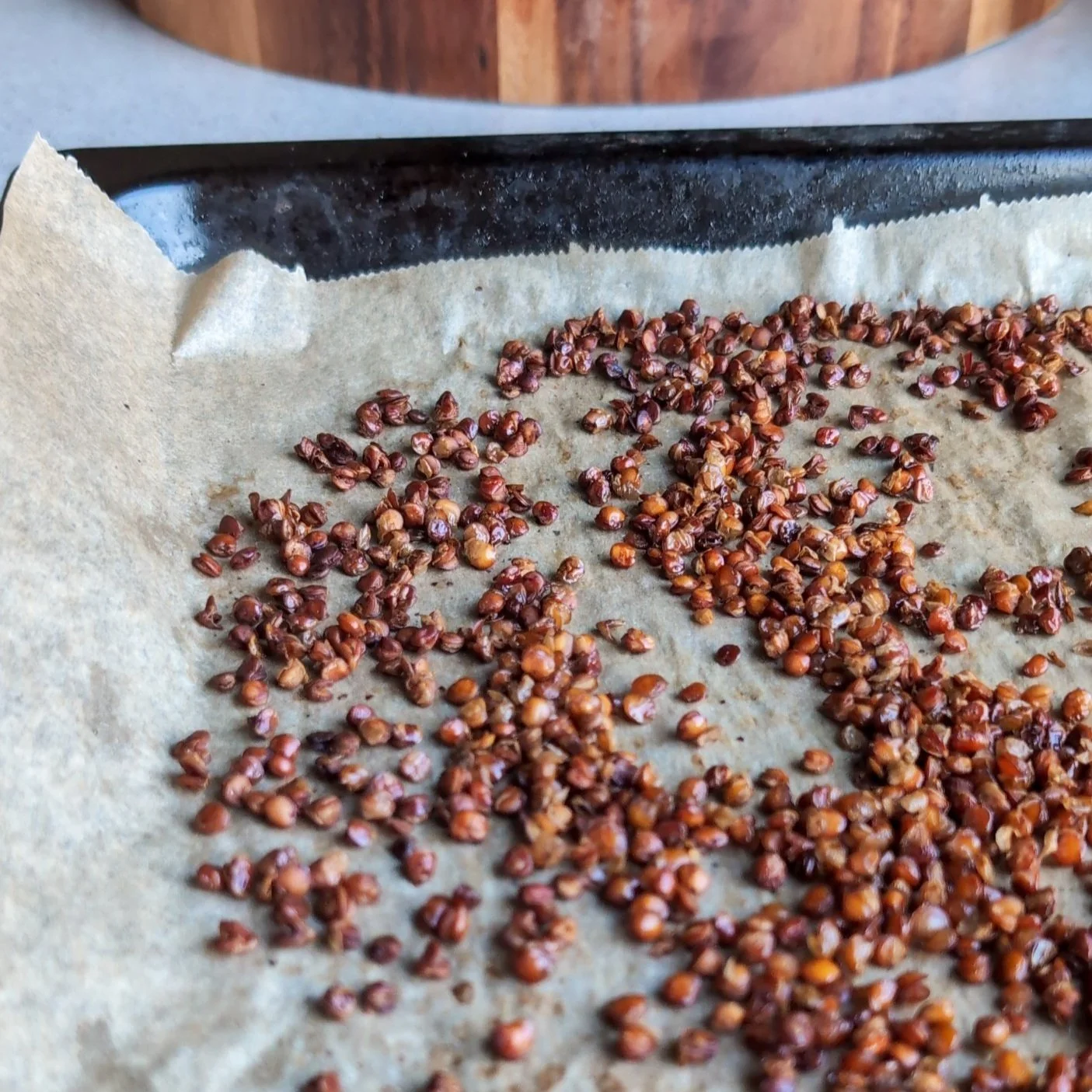 Fordel de ferdigkokte linsene på et stekebrett med bakepapir. Tilsett litt olivenolje, salt, pepper og bland godt. Sett brettet inn i ovnen når gulrøttene er ferdige. La linsene stå i ovnen i 25–30 minutter, og husk å røre litt halvveis. De skal bli skikkelig sprø.